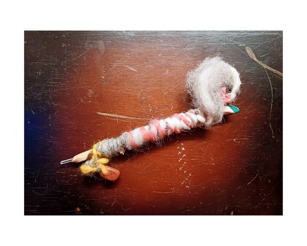 Aan het eind van iedere week knoop ik alle zeven draden / dagen aan elkaar vast en daarmee worden ze met elkaar verbonden. Deze lange draden wikkel ik daarna om een grote staf heen, die eveneens fungeert als een klos. Aan het eind van het jaar zal deze naar verwachting enorm zijn.